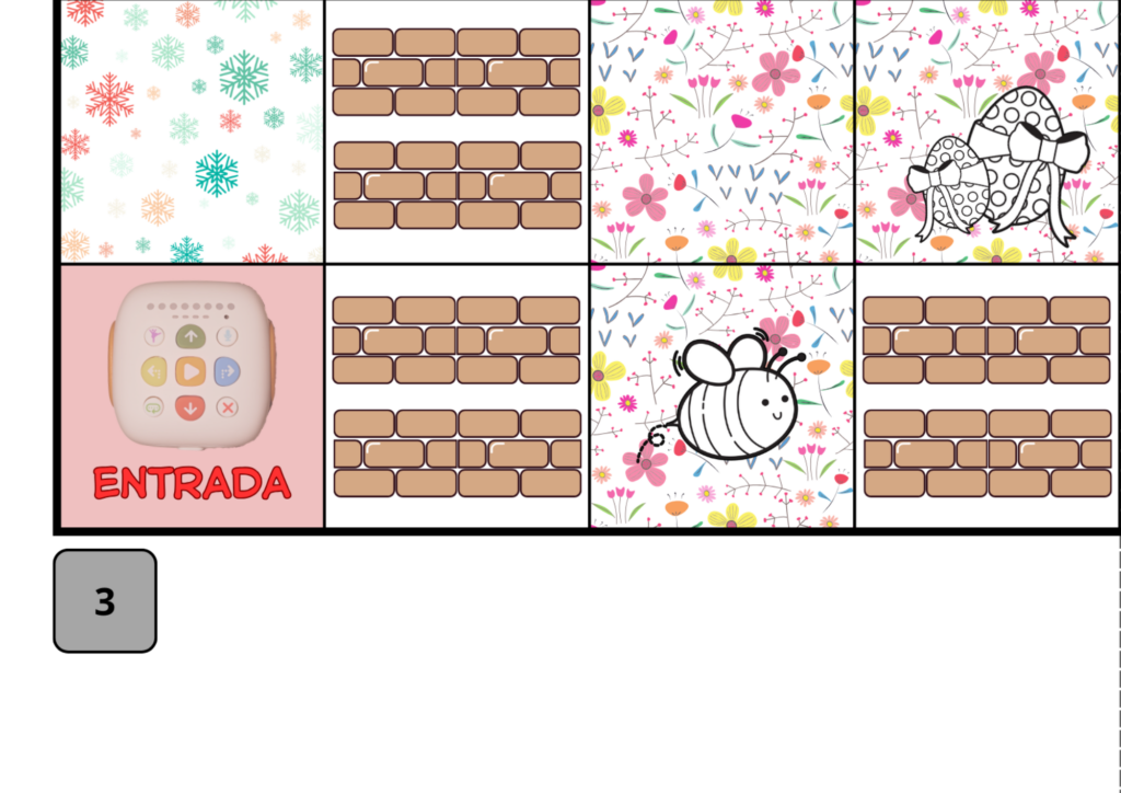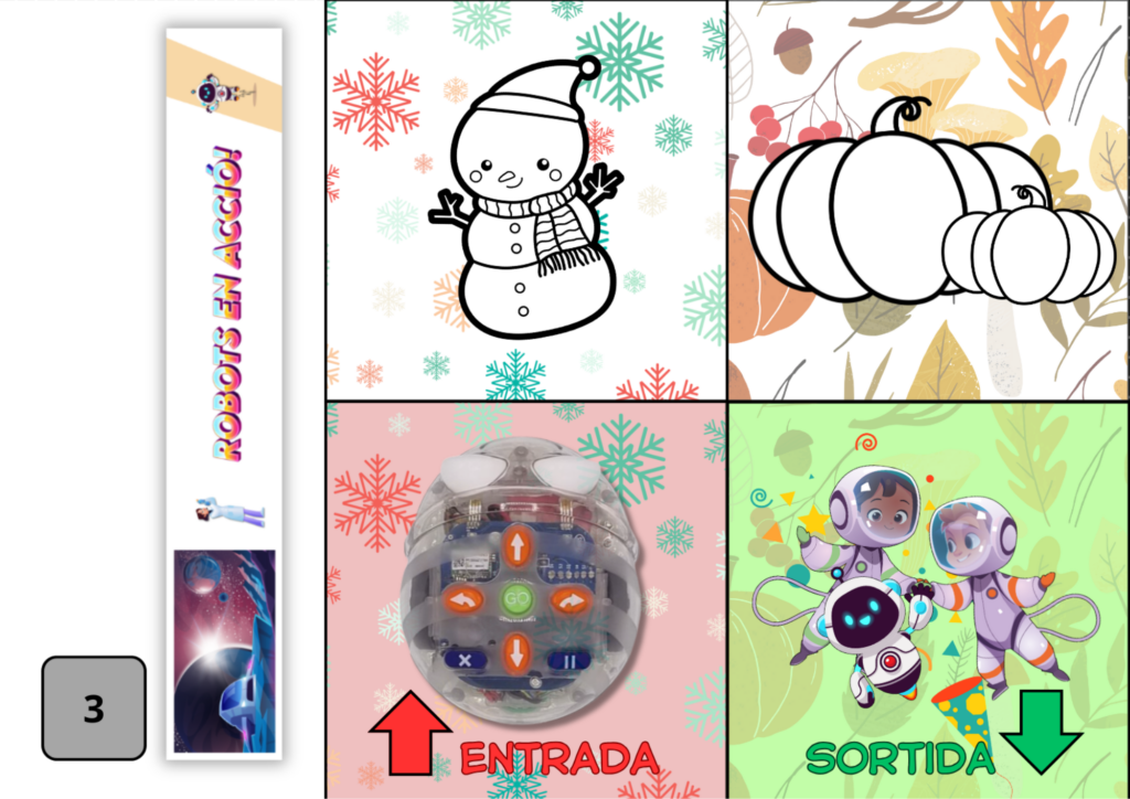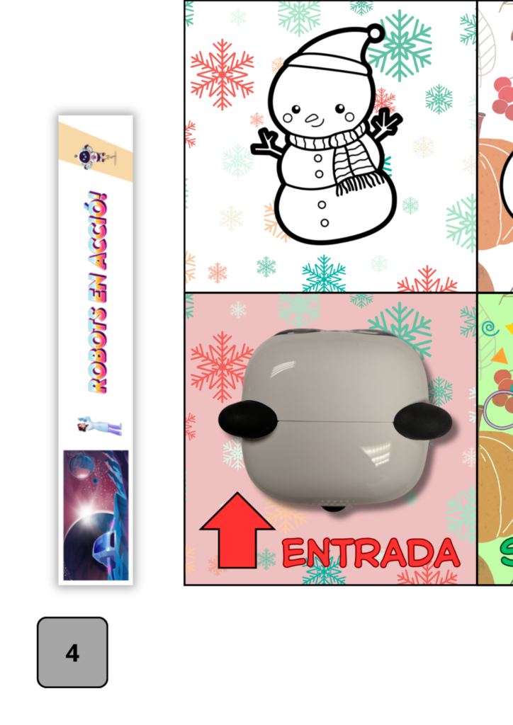 El robot se situa a la casella de sortida i entra en el laberint de l’hivern. Com que fa molt fred, haureu d’agafar les peces de roba d’abrigar i situar-les a les caselles. El robot haurà d’avançar fins a les peces de roba i sortir d’aquest primer laberint ben abrigat.