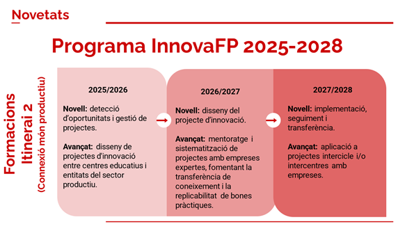 El programa InnovaFP s’organitza en 3 itineraris amb 2 nivells (novell i avançat) per a cada itinerari, conformant un total de 6 xarxes. Al final del 3 anys de participació al programa el centre rep el certificat d’innovació.