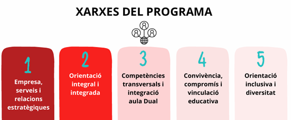 S’estructura en cinc xarxes o línies estratègiques que treballen de manera col·laborativa (empresa, orientació, competències, convivència i inclusió). El model posa l’alumnat al centre i connecta directament centre educatiu i món laboral.