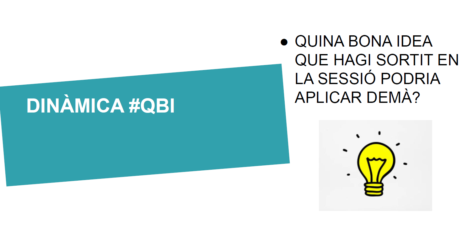 La sessió ha clos amb una dinàmica #QBI i una invitació a implementar alguna de les eines i estratègies oferides durant la sessió i a documentar-les per poder-les explicar en pròximes sessions de compartició d’experiències entre xarxes.