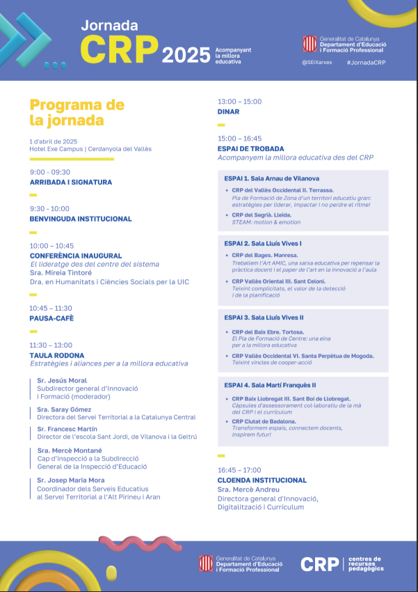 Aquesta trobada serà una oportunitat per compartir bones pràctiques, reforçar aliances i reflexionar sobre el paper clau dels CRP en l’assessorament i l’acompanyament als centres.