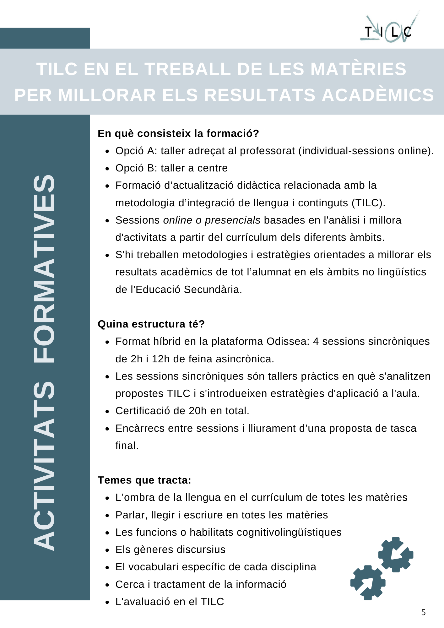 A partir d’avui, dia 7 de gener de 2025, ja us podeu inscriure a les activitats de formació del segon torn del curs 2024-2025. Podeu consultar l’activitat formativa del segon torn de l’àmbit de Tractament Integrat de Llengua i Continguts (TILC) al web d’xtec. Es tracta d’una activitat que acredita 20 hores de formació i us permet fer una introducció als aspectes bàsics del TILC. La formació ofereix 4 sessions online amb formador.