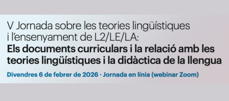 La V Jornada sobre les teories lingüístiques i l’ensenyament de L2/LE/LA: Els documents curriculars i la relació amb les teories lingüístiques i la didàctica de la llengua es durà a terme en línia el divendres 6 de febrer de 2026, de 15.30 a 19.10h (hora catalana).