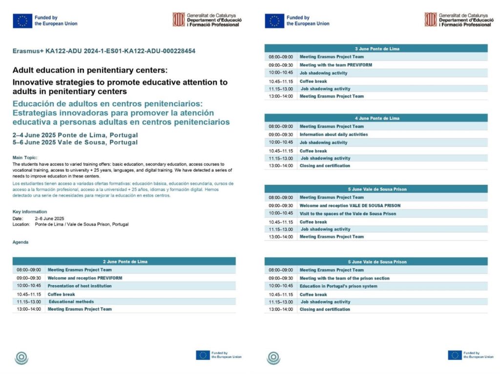 Del 2 al 6 de juny de 2025, dues professionals del Servei d’Educació al Llarg de la Vida han tingut l’oportunitat de participar en una estada de job shadowing a Portugal, gràcies al suport del programa europeu Erasmus+. Aquesta experiència s’ha desenvolupat a dues localitats destacades: Ponte de Lima, una de les viles més antigues de Portugal amb una rica tradició educativa, i el centre penitenciari de Vale de Sousa, on es duen a terme projectes educatius innovadors dins l’àmbit de la reinserció social.