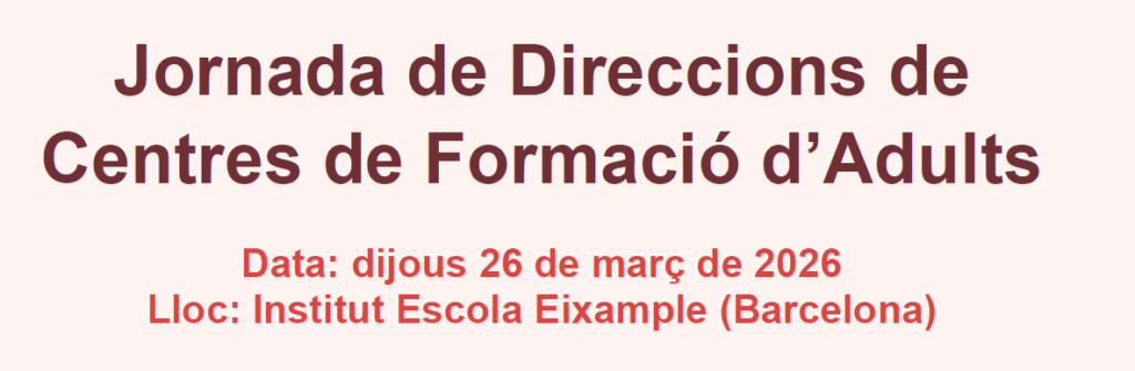 El dijous 26 de març de 2026, l’Institut Escola Eixample de Barcelona acollirà la Jornada de Direccions de Centres de Formació d’Adults, adreçada a directors i responsables de centres de tot Catalunya. La trobada serà una oportunitat per intercanviar experiències i reforçar la col·laboració entre les direccions.